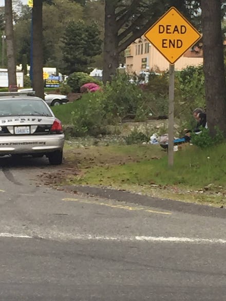 The image shows Mike Huffman, a Washington state sheriff's deputy, pulled over on the side of the road sharing a sandwich with a local homeless man. The photo has been shared by more than 26,000 people.