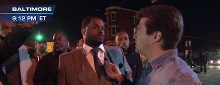 Mosby began the impromptu interview in the streets by explaining the impetus for some of the actions of the young people in Baltimore.