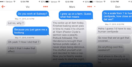 I tried the same lines on different men at different times of day, but the results were largely the same. Everyone thought I was some sort of adorably witty Tinderella who was about as creepy as a kitten. Of course, there were some lines that went universally unanswered — I would recommend against using "Hey baby, I just shit my pants, can I get in yours?" on somebody you actually want to impress — but mostly, people responded to me like I had hit on them with a "Hey, what's up?"