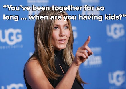 It may the single question that haunts "older" women — aka anyone above the age of 30 — the most. Just ask women like Jennifer Aniston, Jennifer Westfeldt and Oprah Winfrey, who've been subject to more questions about their uteruses than a gynecologist. But in fact, a growing number of women are choosing to go the childless route. Today, nearly half of women between ages 15 and 44 are childless, and a large share of women are delaying having children. Asking a coupled-off woman if she's having kids is making the assumption that it's everyone's prerogative, when it's simply not.