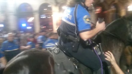 A video uploaded to YouTube on Sunday from Austin, Texas, appears to show officers of the city's mounted police snatching a cell phone away from a bystander, while another officer walking behind hit the individual with pepper spray.