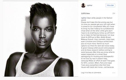 "Why do I have to bring my own makeup to a professional show when all the other white girls don't have to do anything but show up wtf!" she writes in the post. "Stop apologizing it's insulting and disrespectful to me and my race it doesn't help, seriously! Make an effort at least!"
