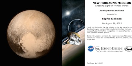 He handed me a printed certificate, titled "New Horizons Mission." It showed a spacecraft drifting through a black, star-strewn cosmos. "Thank you for joining the first mission to the last planet," it read. New Horizons, my father excitedly explained, was the name of a mustard-colored spacecraft headed for Pluto and the rest of the Kuiper belt, a ring-shaped stretch of icy, celestial bodies that extend beyond our solar system. It would explore a new world, he said, a planet — at the time — we knew little about.