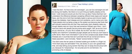 Thankfully, Tumblr user Theremina, who captured the Facebook comments, is reminding us of that, too: "Ohhhh... no. Tess Holliday is a wonderful human being, and this is not okay."