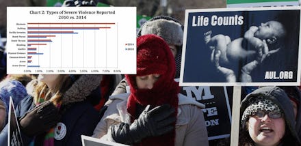 There hasn't been a murder at an abortion provider since 2009 — there have been eight total over the last 25 years — but don't mistake that for a victory in the fight against anti-abortion terror. According to the yearly National Clinic Violence Survey, lighter forms of harassment like blockading and stalking are becoming more common than explicit acts of violence, which are reserved for targeting small groups of vulnerable clinics.