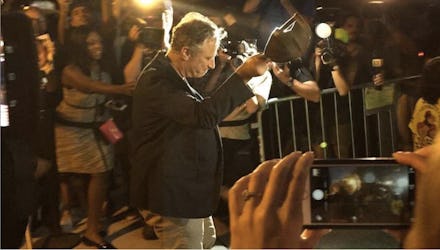 The first, taken by a fan as Stewart left the set, shows a host mobbed by fans, thanking his well-wishers. With his shoulders slightly hunched and holding his hat to the air, Stewart takes a last, small bow.