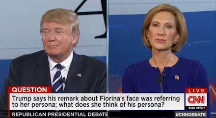 Just before the debate's first commercial break, CNN moderator Jake Tapper asked Fiorina to address the recent controversy surrounding Donald Trump's characterization of her in a recent Rolling Stone profile. Trump was quoted as saying, "Look at that face! Would anyone vote for that? Can you imagine that, the face of our next president?!" Trump later said he was talking about Fiorina's personality.