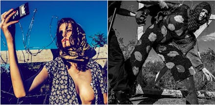 Amid this backdrop, one fashion photographer in Hungary thought it would be a good idea to do a photo shoot for a magazine inspired by the crisis. The spread, titled "Der Migrant," features a slender woman with her hair aflutter under a scarf. In one photo, her breasts peek out from under a shirt as a man grabs her and seems to drag her out of frame. In another photo, she looks up from her unbuttoned top, just covering just her nipples, and gazes into what looks like a case of cigarettes with the Chanel logo — maybe taking a selfie?