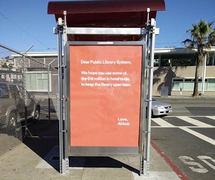 The ad outside of the Ingleside Library reads: "Dear Public Library System, we hope you use some of the $12 million in hotel taxes to keep the library open later. Love, Airbnb."