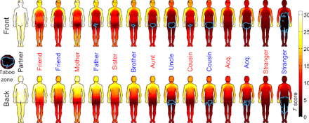 A recent study has determined which parts of the body are most universally accepted as "touchable" by various members of one's social circle, as well as which body parts are off-limits. The "bodily map" is organized by relationship type and gender. Basically, the darker the area, the more likely it will be considered taboo to touch that particular person there.