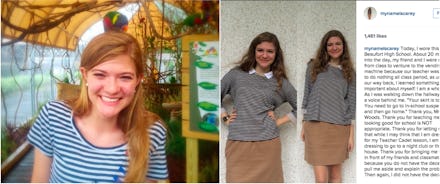 In Burgess' case, the item in question was a skirt, not cleavage or a crop top — and she happens to be a star student and leader (something that shouldn't matter for how students are targeted by school policies). Burgess eventually met with the school principal and wasn't suspended. In fact, the principal told the Beaufort Gazette that Burgess' outfit was within school rules.