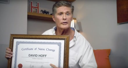 The video, titled "Goodbye David Hasselhoff," shows "The Hoff" sitting in his home in a semi-unbuttoned shirt, holding a plaque which shows a legal name change certificate. "I've been wanting to drop the hassle from my life for years," Hasselhoff — sorry, Hoff — explains in the clip. "Now, I have made it official. David Hoff." he says, pointing at the certificate.