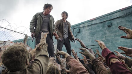 Many viewers thought Glenn was killed off during the third episode of The Walking Dead's current season, in which the character found himself atop a dumpster with a fellow survivor of the outbreak. The two quickly became surrounded by walkers, causing the other to commit suicide, shooting himself in the head and toppling over into the growing crowd of the dead and dragging Glenn along with him.