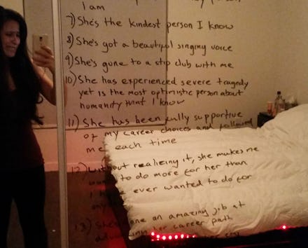 "He knows I struggle to see good in the world, and especially the good in myself. But here it is," she wrote. "A testament and gesture of his love. Damn, I needed it today." She added that she realizes "mental illness [cannot be] cured by nice words on a mirror" but that depressed peoples' loved ones should still strive to "show them kindness and remind them things can and WILL get better."