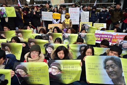 Protests have been held outside the Japanese embassy in Seoul on a weekly basis since 1992, according to Reuters. The average age of the remaining 46 survivors is 89 years old, and though their government has reached an agreement around their cause, Wednesday's protests suggest the issue is far from resolved for many of the victims.