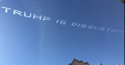 Against the stark blue California sky, skywriters wrote, "America is great! Trump is disgusting," "Anyone but Trump" and "Trump is a fascist dictator." CNN reported that the identity of these gutsy pilots remains unknown, but a national aerial advertising firm called Air Sign took credit for the scheme on Twitter. They thanked users for sharing photos and encouraged them to visit the website AnybodyButTrump.us.