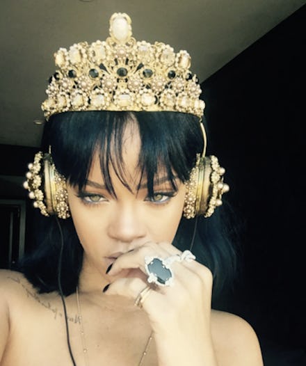 The 27-year-old is seen with gold plated headphones, as well as a matching gold crown and ring emblazoned with black gems, mirroring the theme of her album's promotional campaign, #ANTIdiaRy. Perhaps not so coincidentally, Rihanna's message to fans comes the same day Kanye West announced the completion of his album, Swish.