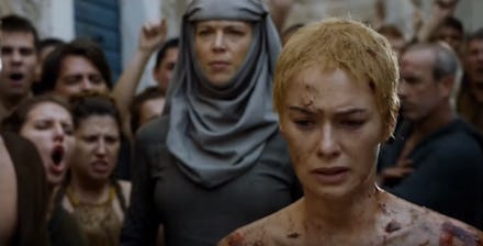 In the season five finale, Cersei Lannister (Lena Headey) is forced by the High Sparrow (Jonathan Pryce) and his religious sect to atone for her sins of incest and adultery by, essentially, going through a walk of shame across the streets of King's Landing. It's a gruesome scene, with Cersei (sporting her newly shaven head) mercilessly abused by the commoners of King's Landing by means of dirt, food, sewage and bodily fluids. All the while, a Septa rings a bell and repeatedly chants, "Shame."