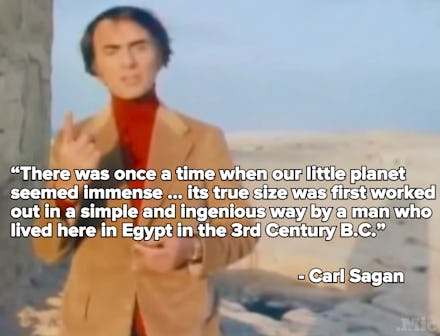 Sagan explains that Eratosthenes went on to use the information he learned to calculate the circumference of the Earth — and he was pretty close to accurate. Sagan totally lays it down like an expert, so if B.o.B hasn't seen this clip yet, he probably should get on that. And if that still isn't enough to convince flat earth conspiracy theorists, how about the fact that no one has ever fallen of the edge of the planet?
