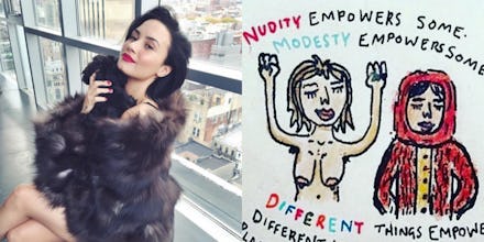 "Nudity empowers some. Modesty empowers some," read a cartoon of two women, one naked and one clothed, that Lovato uploaded Tuesday to Instagram, following the backlash from Kardashian West's recent nude selfie. "Different things empower different women and it's not your place to tell her which one it is."