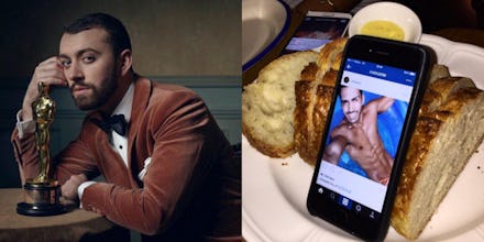 Some people use fitness blogs and Instagram in order to get their daily inspiration to stay on their health kicks. Academy Award winner Sam Smith's inspiration takes him a step further, quite literally halting the musician in his tracks from eating unhealthy. Thanks (at least in part) to Instagram and its plethora of hot torsos and male models, Smith is avoiding extra carbs by ingeniously placing Instagram pics of hot men on top of bread.