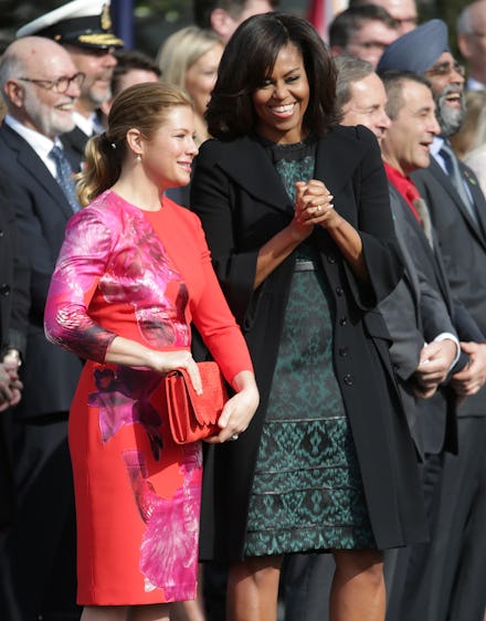 Obama wore a green dress by Canadian-born designer Tanya Taylor while Grégoire-Trudeau wore a red and fuchsia dress with custom-printed silk floral appliqués by Canada-based designer Lucian Matis.