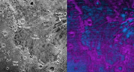 Scientists think the bite mark is caused by methane on the surface sublimating into a gas and exposing a layer of ice below. You can see the dark-colored mark in the center panel below: The false color image on the right shows methane (purple) and ice (blue). You can see how the bite mark is made of mostly ice, not methane:
