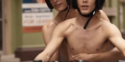 The less-than-salacious CK2 advertisement spotlights two straight couples, a lesbian couple and a gay couple. The lesbian couple flashes oncoming traffic from a highway overpass and the gay couple motorcycles shirtless down a street, but only the straight couples actually kiss.