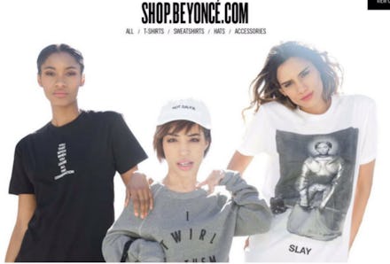 Over on Beyonce.com, Mercado models a slew of some of Beyoncé's latest "Formation" merch, including a white T-shirt with a photo of Queen Bey in a suit of armor over the word "slay" (natch), a black T-shirt that reads "you that bitch when you cause all this conversation" (obviously) and a gray sweatshirt with "I twirl on them haters" painted across the front (because of course).