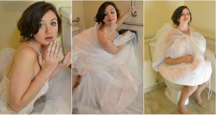 Walking down the aisle in a heavy, poofy tulle wedding gown, trying not to topple over can be scary. But the real nightmare? Lifting up the skirt to pee.