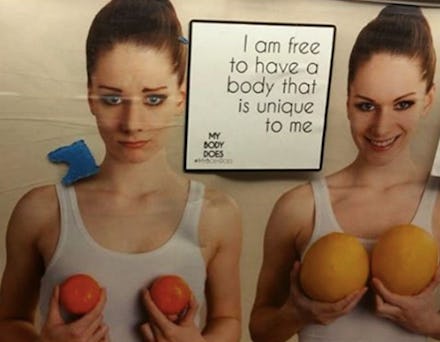Andersen and Simon started making body-positive stickers with messages like "I am free to have a body that is unique to me" and "My body is a source of joy" and pasted them up over the ads that they felt imposed harmful body standards on women — like those gross ads for breast augmentations that show a smiling woman holding grapefruits to her chest.