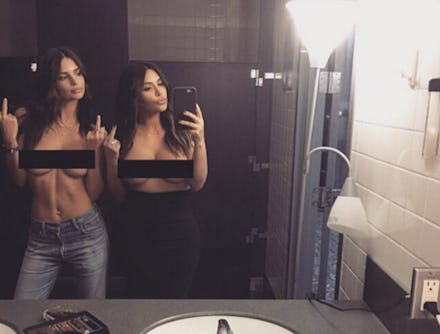 If you thought Kim Kardashian West was done breaking the internet, think again: Not only is the international reality star flashing the world once more, but she's doing it with the help of supermodel Emily Ratajkowski. The photo, which will certainly be viral by the time you're finished reading this, comes with a powerful message Ratajkowski wrote about women and sexuality.