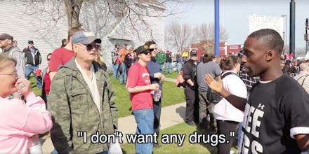 No one seemed especially receptive to Nwadike. One man told him, "I don't want any drugs," when Nwadike approached him for a hug. One woman threatened to punch him in the face if he did not vote for Trump.