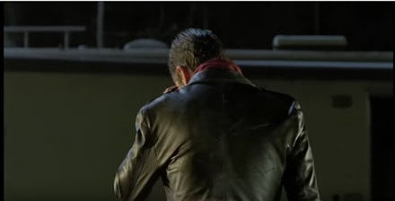 Sporting a black leather biker jacket and his beloved Lucille — a barbed wire-coated baseball bat — Negan appears out of the crowd of Saviors that have ambushed Rick's group on the road as they attempted to take Maggie (Lauren Cohen) to the Hilltop Colony following problems with her pregnancy.