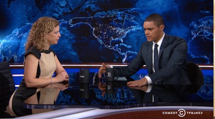 On Monday's Daily Show, Trevor Noah welcomed Democratic National Committee chairwoman Debbie Wasserman Schultz. Echoing predecessor Jon Stewart, Noah mostly eschewed the jokes in lieu of a serious interview with the Florida congresswoman about the state of the Democratic primary race.