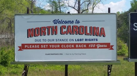 "Welcome to North Carolina," a billboard off N.C. Highway 108, along the North and South Carolina border, reads. "Due to our stance on LGBT rights, please set your clock back 100 years."