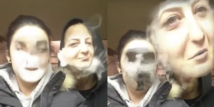 When you cover your face with smoke, the face-mapping algorithm will keep looking for somewhere to put your face. In this case, the woman turns into a smoke-face ghost and the man watches his face drift away with those righteous plumes.