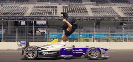 Stuntman Backflips Over Speeding Formula E Car Despite What Every Law of Physics Says