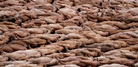 Which sounds a lot like protest, especially in light of his tweeted statement, "For our daughters, I couldn't stand by and do nothing." But this isn't Tunick's first rodeo: He's currently working on a 6,000 person assemblage in Bogota, Colombia, and in the past, he's gathered 2,500 naked bods in Cleveland.