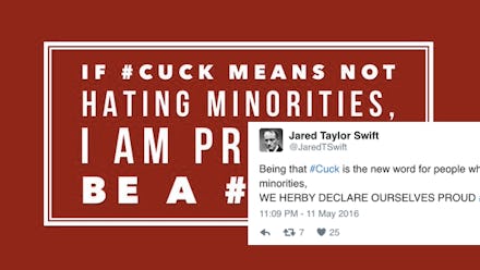 What "cuck" means in 2016: The alt-right uses cuck or "cuckservative" as code for "race traitor," labeling conservatives who disavow their party's radical fringe as beta males who've let their household be overrun. The term "cuck" frames social justice in terms of dominance, evoking traditionally racist and colonial panic about black bodies and implying that African-American men pose a violent and sexual threat to white women and white households.