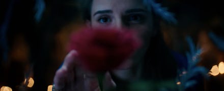 Suddenly, the camera turns to Beauty and the Beast's iconic rose, as vividly red as ever. A girl slowly approaches the flower, her face obscured by its petals. Yet just her eyes are enough to make clear: This is Watson's Belle.