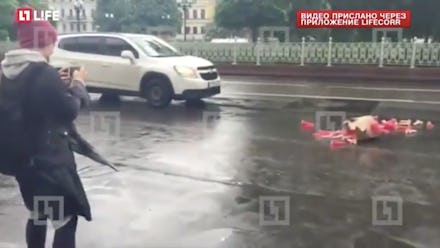 Because it's 2016, no phallic mound goes unseen. Although no one appears to help this man collect his dildos and dignity in the middle of the road, they do stop to document the scene. Dick pics or it didn't happen.