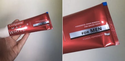 And yet, the idiocy continues. On Monday, one Twitter user recently tore into Colgate for its "Max White for Men" product, advertised as a toothpaste with "powerful stain removal" that is "Power Peppermint" flavored. The product appears to only be available overseas.