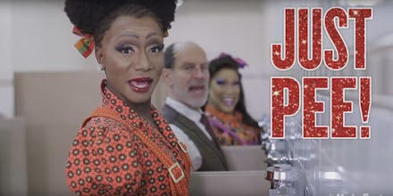 "Just pee, with dignity/ Go relieve yourself triumphantly," the performers tell viewers.