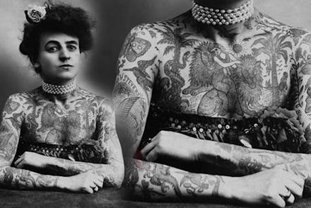"She wore patriotic tattoos, tattoos of monkeys, butterflies, lions, horses, snakes, trees, women and had her own name tattooed on her left arm," Inked author Margo DeMello wrote. "Because she was extensively tattooed by her husband, she also worked as a tattooed attraction garnering considerable fame for herself."