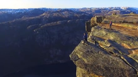 In this instance, it is aerial footage of Kjeragbolten, a boulder in Norway wedged into a mountain crevice thousands of feet above a chasm.