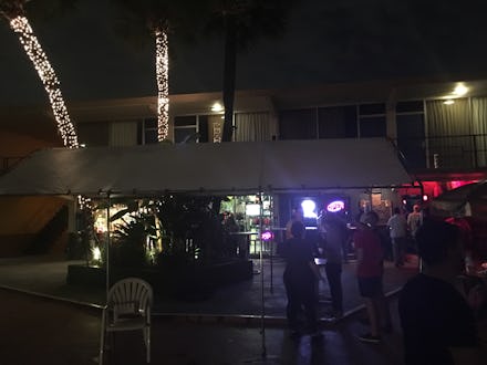 Stacks of free water bottles donated by a local hardware store greeted those who entered the open-air courtyard, where organizers had erected white canopies to shield from the rain. Flanked by walls of hotel rooms, Parliament House's sprawling layout includes a disco and lounge to the right of the entrance, a "bear den" in the back.