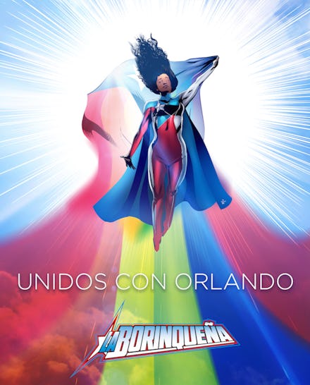 The image below was made by illustrator Dennis Calero, under Miranda-Rodriguez's art direction. It depicts La Boriqueña flying through the air with a massive rainbow-patterned Puerto Rican flag waving behind her.