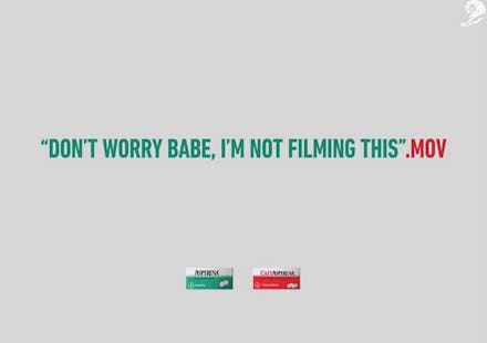 Dubious comma splices aside, the ad raised a few eyebrows as it seemed to suggest that a man was filming he and his partner having sex without her consent. The man, somehow, seems to be the one who needs an aspirin after his girlfriend, wife, "babe," what-have-you, finds out she's been filmed without her knowledge and yells at him (or, if you prefer, acts hysterical).