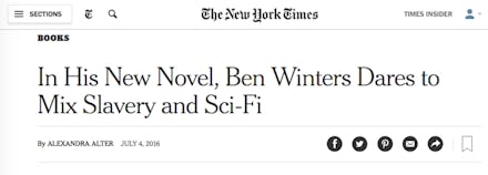 "In His New Novel, Ben Winters Dares to Mix Slavery and Sci-Fi," the article title reads, for instance — neglecting to mention that black author Octavia E. Butler "dared" to do the same thing 40 years before Winters did it.